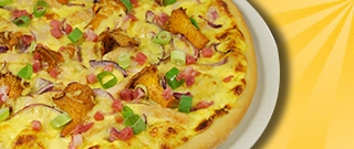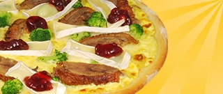26er Pizza belegt mit Sauce Hollandaise, Gouda, Broccoli, knusprige Entenbrust, Camembert und PreiselbeersoßeA,B1,C,10