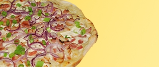 Flammkuchen "Elsass" ø 26 cm ist belegt mit Schmand, Bacon, rote Zwiebeln, Frühlingszwiebeln {B1,C,5,10}.